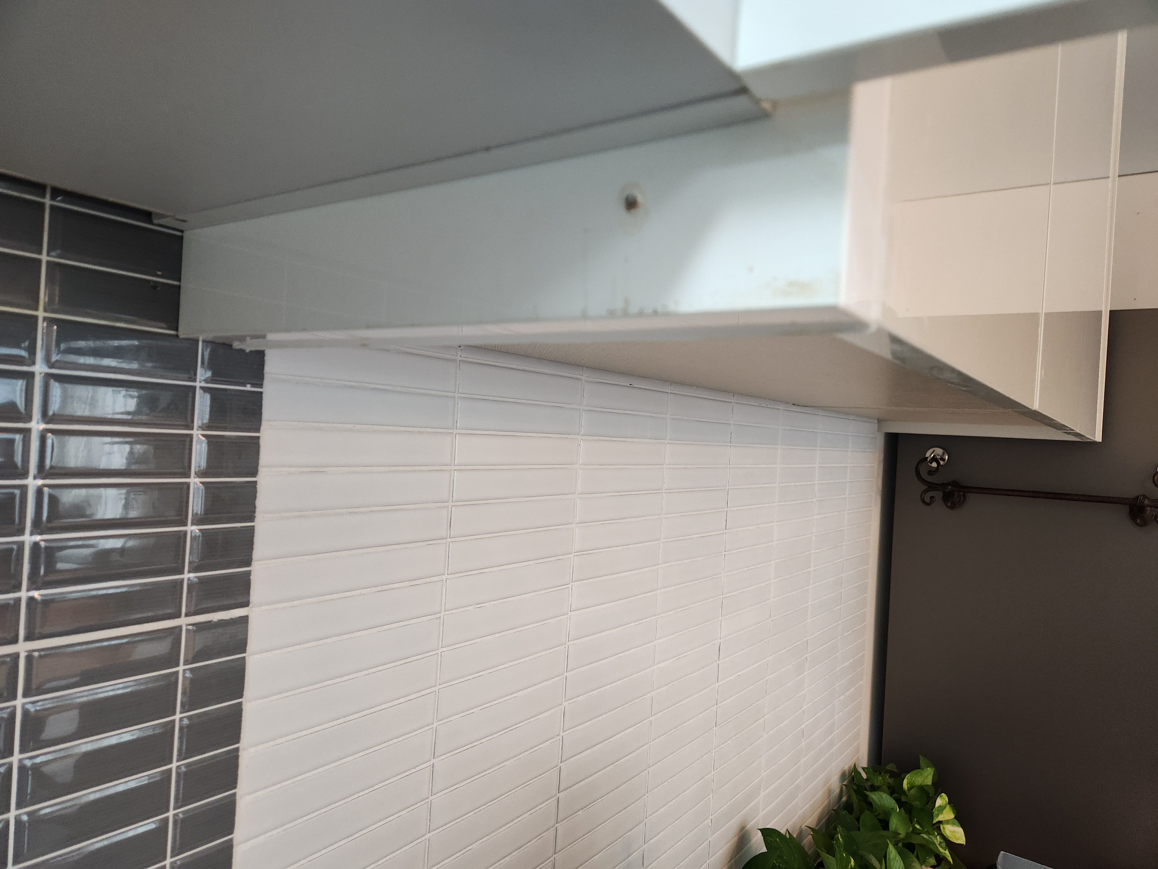 후드를 떼어낸 타일 벽면에는 5년의 세월 동안 알게 모르게 스며든 유증기가 얇은 막을 형성하고 있었습니다.